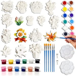 Your kit will include a ceramic flower magnet (random design), paints and paint brush.